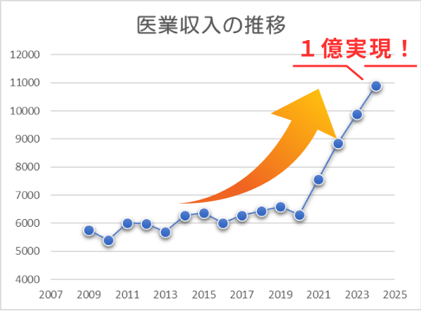 こちらの医院は「15年以上」医業収入が伸び悩んでいましたが、コンサル導入から4年で医業収入年間1億円を実現しています。