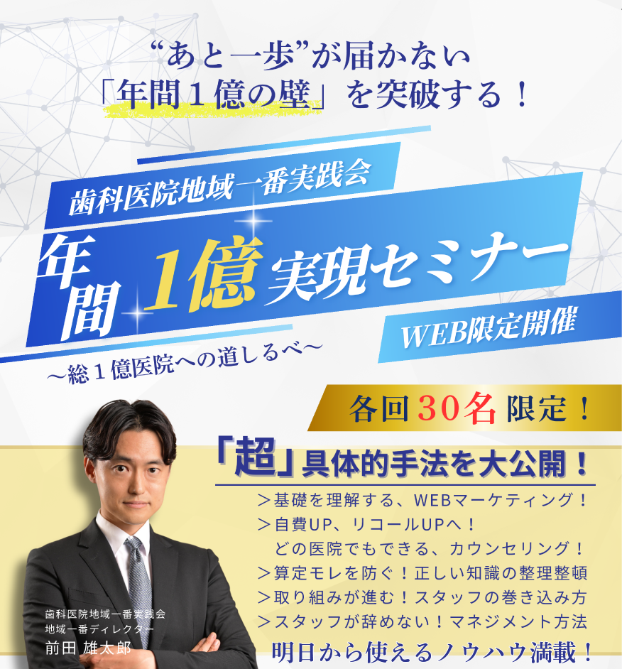 |  講師 歯科医院地域一番実践会 地域一番ディレクター 前田 雄太郎 福井県出身。大学を卒業後、健康食品メーカーに入社。入社3年後に、取締役に就任。その後勤務した、製薬メーカーの営業部門、研修部門の両部門で優秀社員賞を受賞。歯科医院地域一番実践会の中でも、「年間1億以上の医院への成長を最も多くサポートしているコンサルタント」。自費だけのマーケティングではなく、施設基準や保険算定にも精通。院長の考えに寄り添いながら、確実に医院を成長させる。 | 第1講座 | 1億実現の意義と考え方 年間1億を実現するためには、明確な目標設定と戦略的な数値管理が鍵となります。第1講座では、1億実現の意義を再確認し、その達成に必要な考え方をわかりやすく解説します。 |