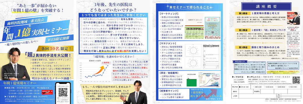 | 第2講座 | 1億実現!「超」具体的ノウハウ 第2講座では、明日から取り組める、超具体的なノウハウを余すことなくお伝えします。また、実際に取組んだ医院の成功事例もご紹介しますので、取り組みのイメージを明確に持つことが出来ます。 | |