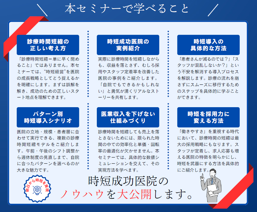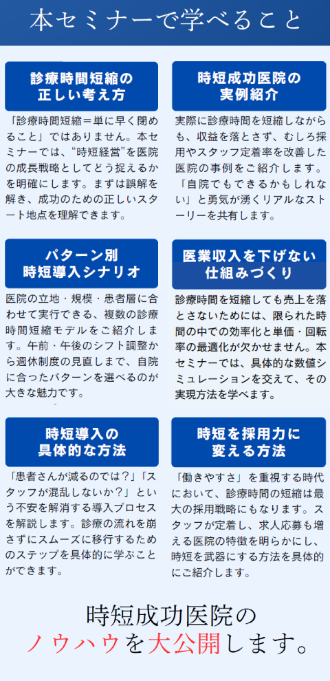 01スタッフ全員が前向きになる時短の目的と伝え方 時短の目的を共有し、不安を安心に変える院内コミュニケーションの実例を紹介 02時短しても医業収入を維持するための数値シュミレーション 「時短=売上減」という不安を払拭!時短前に数値で見える化 03患者数を減らさずに時短を実現する方法 診療終了時間を1時間短縮しても、患者数を減らさない方法を紹介 04時短をしても生産性・診療単価を高め、医業収入アップ 高単価アポを増やし、時間効率を高める仕組みを事例で紹介 05午前中などの埋まりにくいアポを埋め、稼働率アップ 「午前中に来やすい層」に合わせた来院導線と、キャンセル対策を公開 |